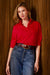 Feminine charm, casual disposition. Elevating the aesthetic of a laid-back look, this easygoing silhouette pairs perfectly with high-waisted pants thanks to its slightly shorter cut. Gentle shirring on the sleeves adds texture and volume, accented by a subtle ruffle that edges the neckline. Elbow-length sleeves with a slight billow deliver the classically cool finishing touch.