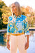 An oversized Jacobean print takes on a tropical twist in Margie. Swirling with vibrantly tonal shades, it electrifies a classic silhouette that’s defined by a point collar and rounded hem. Contrasting yet coordinating cuffs reveal a surprise: one is a gentle shade of pistachio underneath, while the other shows off soft aqua. Flip the collar and you’ll find a matching pistachio hue as the finishing touch.