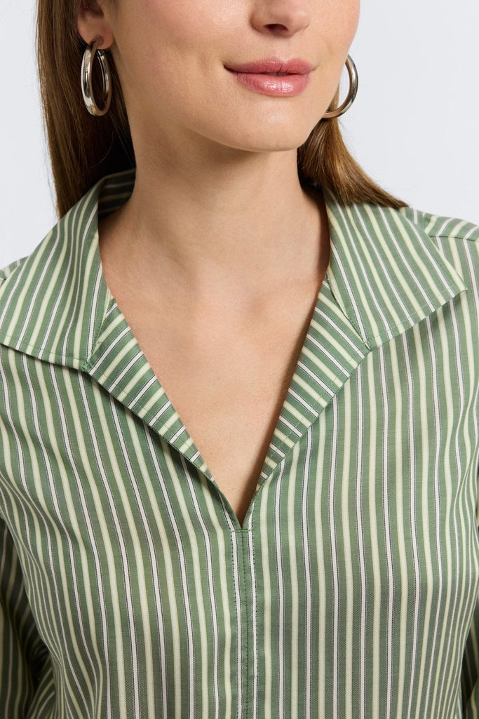 Ease, updated. This edition of Agnes plays with stripe proportions for a fresh twist on a timeless classic. Rendered in basil and silver, the print adds soft dimension with a clean, vertical layout that elongates the silhouette. Made from 100% Lyocell, it’s breathable, drapey and effortless from day to night. Signature flip-up cuffs finish the look with a touch of attitude.