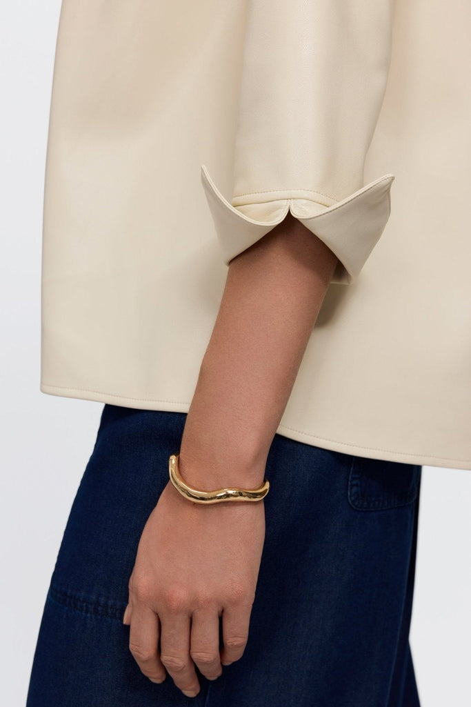 Sleek, effortless, and modern—Agnes redefines everyday polish in rich vegan leather. Designed with a streamlined silhouette and a soft structure, this piece is equal parts comfortable and refined. The open notched collar and clean front seam detail elevate the minimalist feel, while long sleeves with cuff accents offer versatile styling. Whether worn tucked, layered, or loose, Agnes brings a cool sophistication to any look.