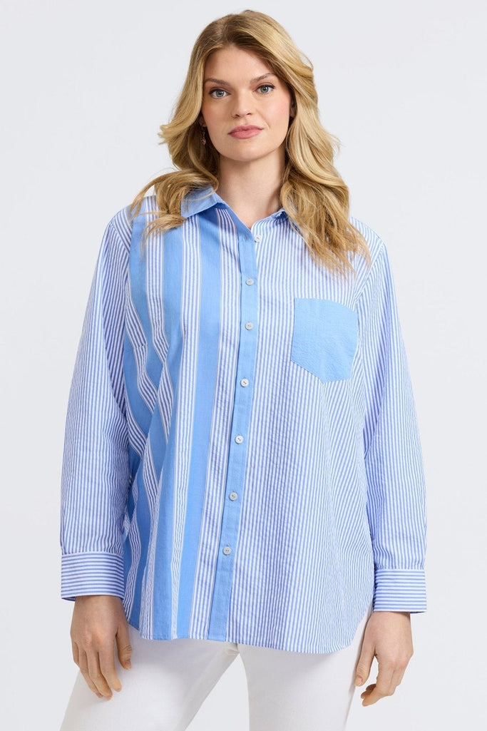 With a modern spin on classic menswear, our timeless Boyfriend shirt delivers a bold yet versatile look for you. Tonal blue stripes add depth and sophistication, striking a perfect balance between statement and staple. Made from silky-soft seersucker, it shows off a unique stripes-within-stripes pattern that redefines timeless style. The oversized silhouette, complete with an elongated back hem, offers a relaxed, laid-back feel — ideal for everything from casual weekdays to cozy weekends.