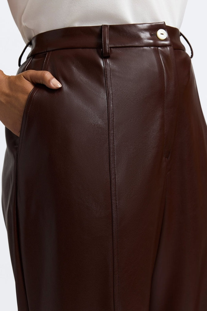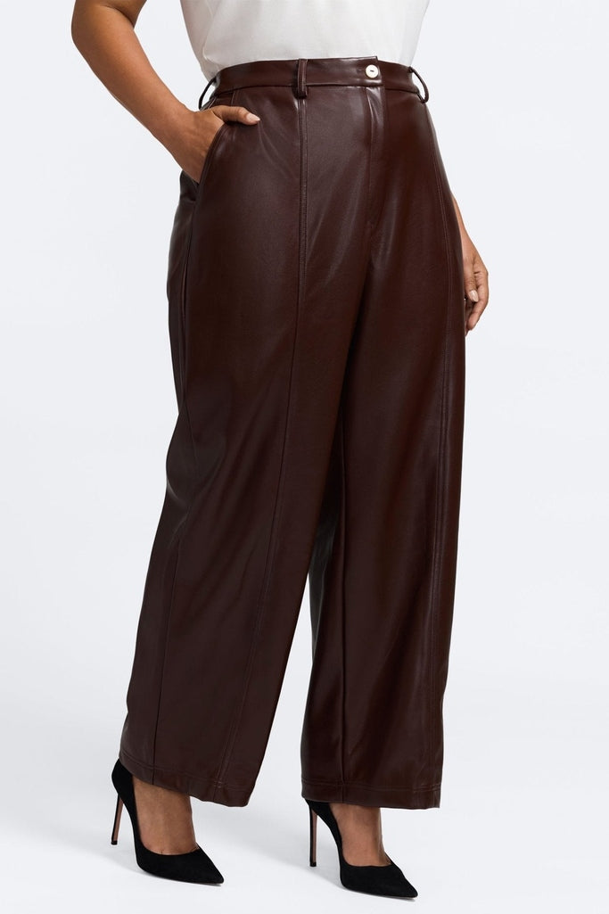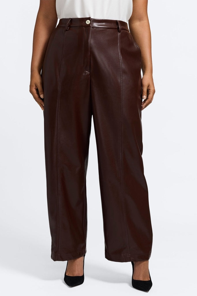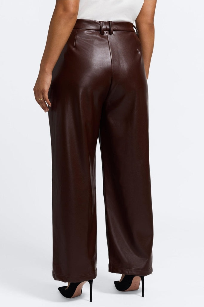 Elevate your wardrobe with our newest pant, the Ciara Vegan Leather Wide-Leg Trouser. Designed with a modern silhouette, these trousers combine effortless sophistication with on-trend edge. Crafted from soft, cruelty-free vegan leather, they feature a tailored waistband with belt loops, front seam detailing for elongation, and a wide-leg cut that moves with ease.