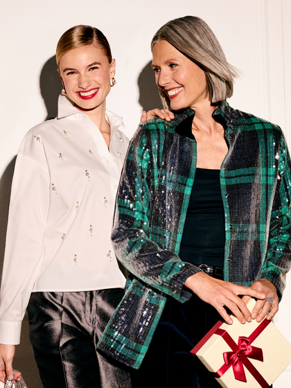 Classic plaid goes glam in Marina. Sewn on sequins add allover sparkle, perfect for holiday parties or festive nights out. Contrast black accents at the collar, placket and cuffs refine the look, while the boxy, slightly shorter cut pairs effortlessly with high-waisted pants. A chest pocket and bias-cut back yoke complete the design with tailored appeal. Equal parts spirited and sophisticated, it’s a modern twist on timeless plaid.