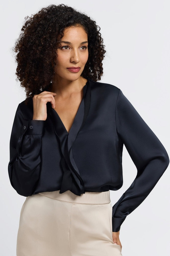 Chic and sophisticated, the Rosalie Beyond Silk Shirt is the ultimate wardrobe essential for timeless elegance. Crafted from luxe satin-like fabric, this blouse features a soft sheen and drape that elevates any look. Its soft, fluid-like ruffle collar and placket create a smooth, seamless V-neckline while long sleeves with button cuffs add effortless polish to a relaxed fit.