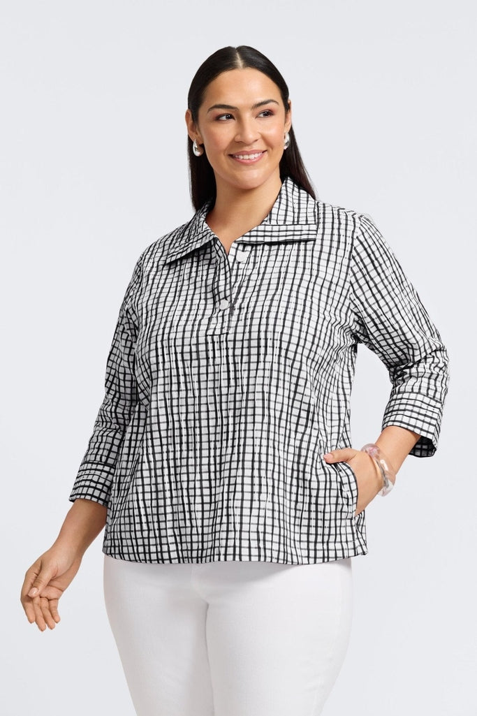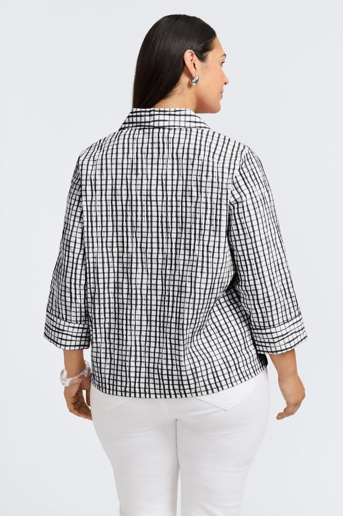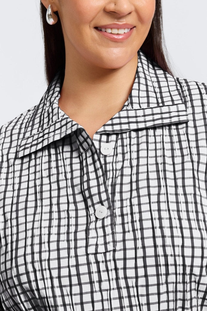 Effortlessly relaxed and endlessly versatile, Sammy is your new everyday favorite. Made from our ever-popular crinkle fabric, it combines comfort with casual sophistication — and just the right amount of scrunchy texture. Button up the collar for a mock-neck look, or let it lie flat for an open shape that frames your face. The scaled-down windowpane print is a classic that pairs especially well with denim.
