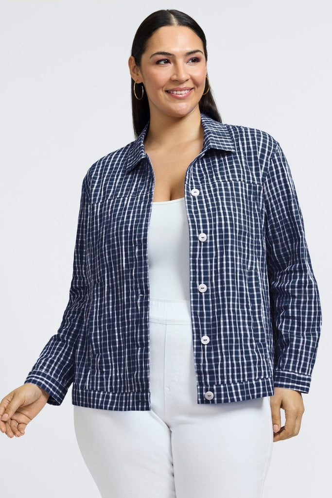 The classic jean jacket gets a fresh twist. Made from our signature crinkle fabric, this lightweight layer offers textured style and easy comfort for effortless layering. The banded hem creates a flattering fit at the hip, while classic button cuffs add a timeless finish. An allover windowpane print delivers a crisp, modern touch. Combining iconic style with easy-care wear, Thelma is as practical as it is chic — perfect for the demands of everyday life.